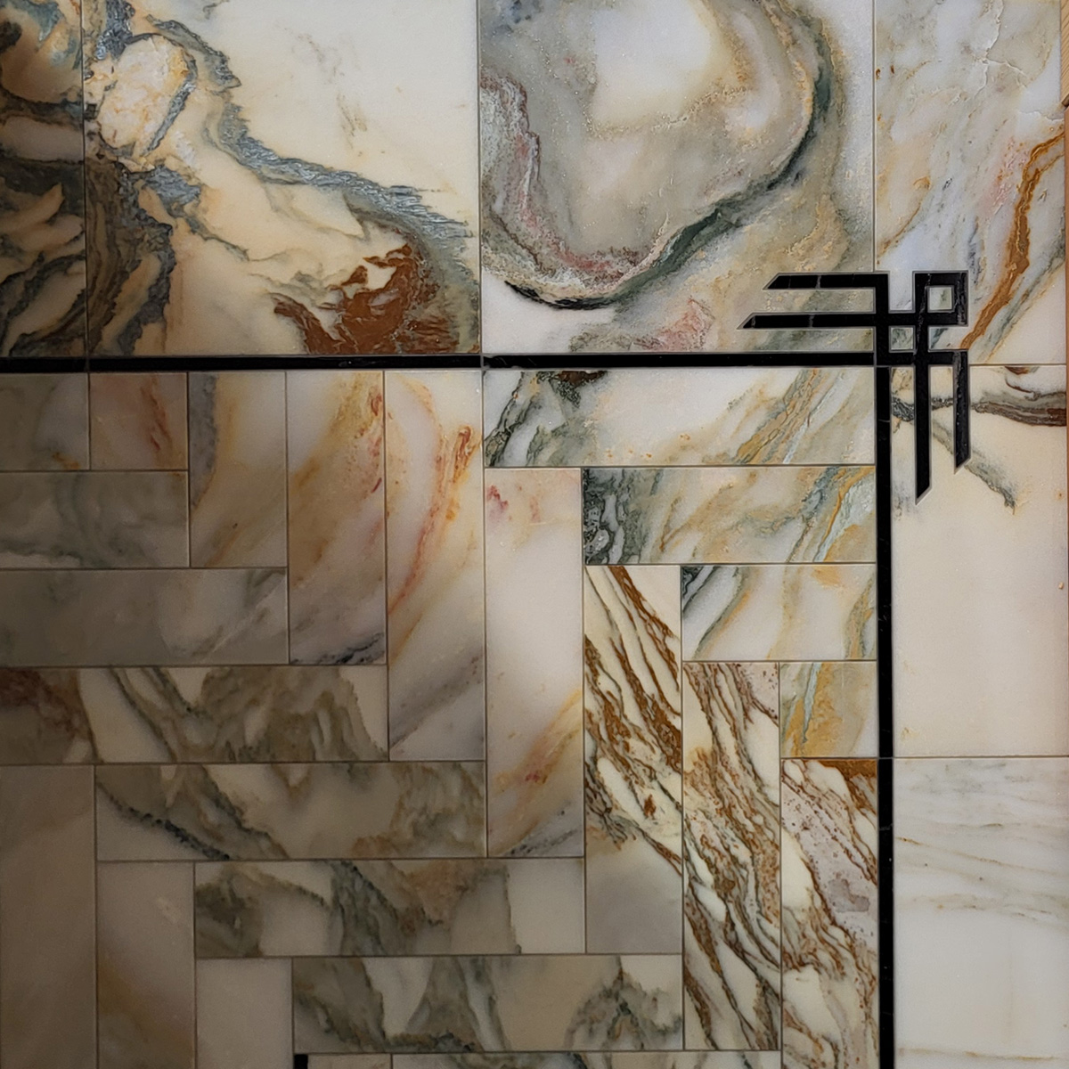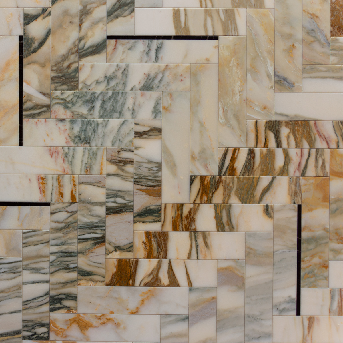 This mosaic design is a very rich extension of classic parquet flooring patterns. The marble used in this project, Calacatta Yellow-Green, is incredibly colorful. It brings a wealth of cheerful and warm colors to the room, completely replacing carpet. To structure this mosaic, it features black inserts and elegant Brazilian Cosmic Black quartzite accents. The overall effect is a stunning composition that challenges the claims that marble floors are cold and boring. This mosaic is a truly eye-catching work of nature and man. It combines the beauty of a unique multicolored stone with the aesthetics of a design that systematizes it into a beautiful pattern. Despite the intense colors, the gently shifting color streaks in the stone's structure give this mosaic a very pleasant character.