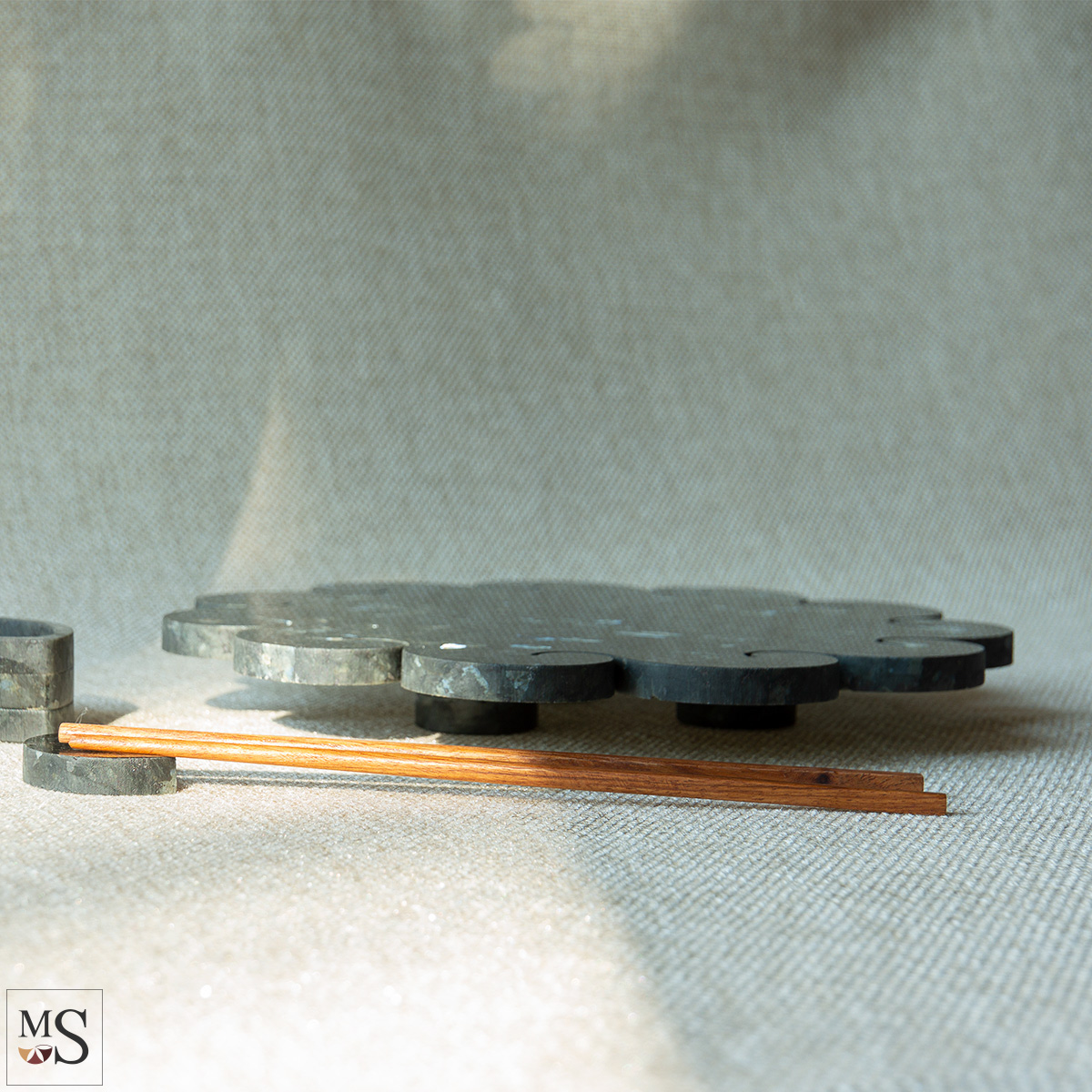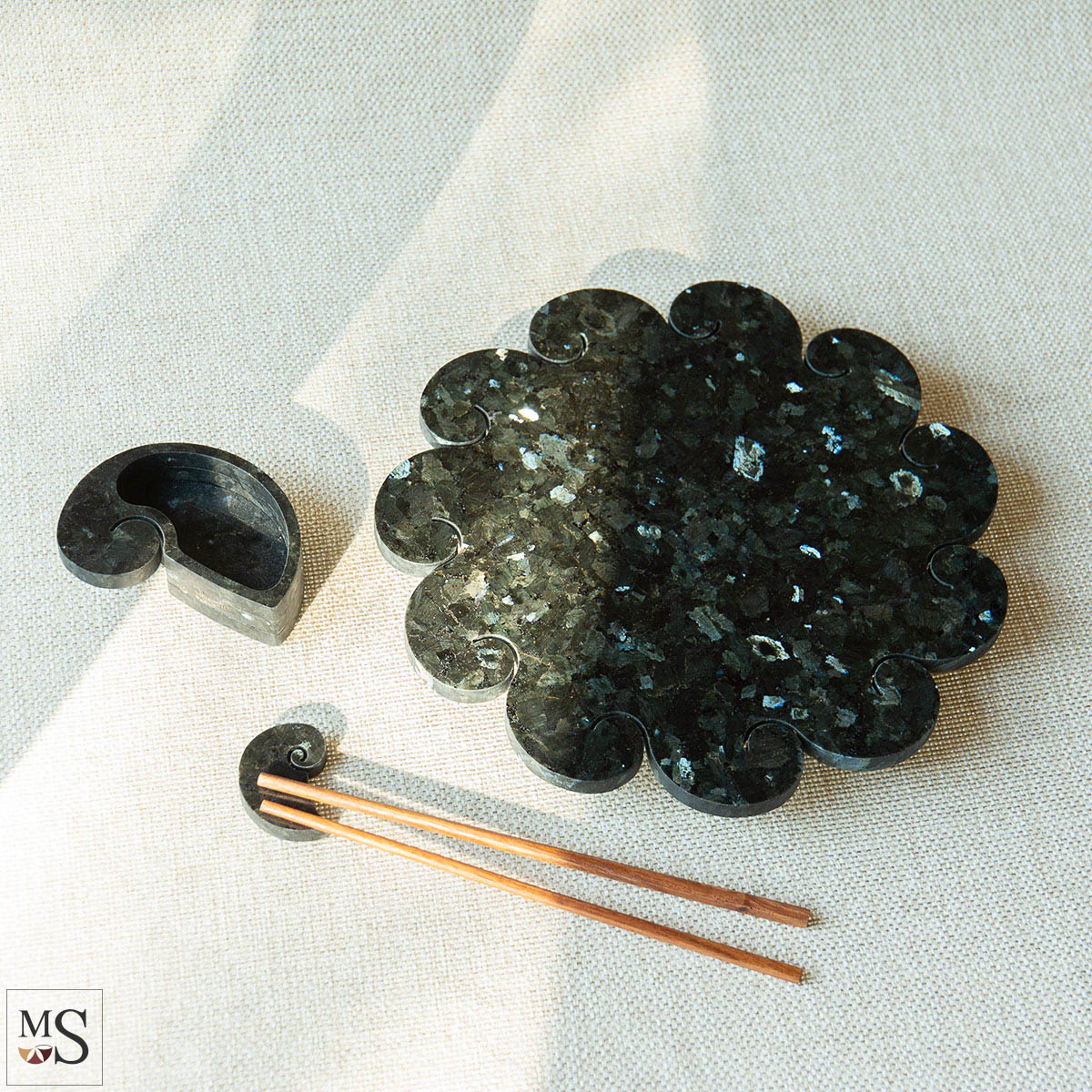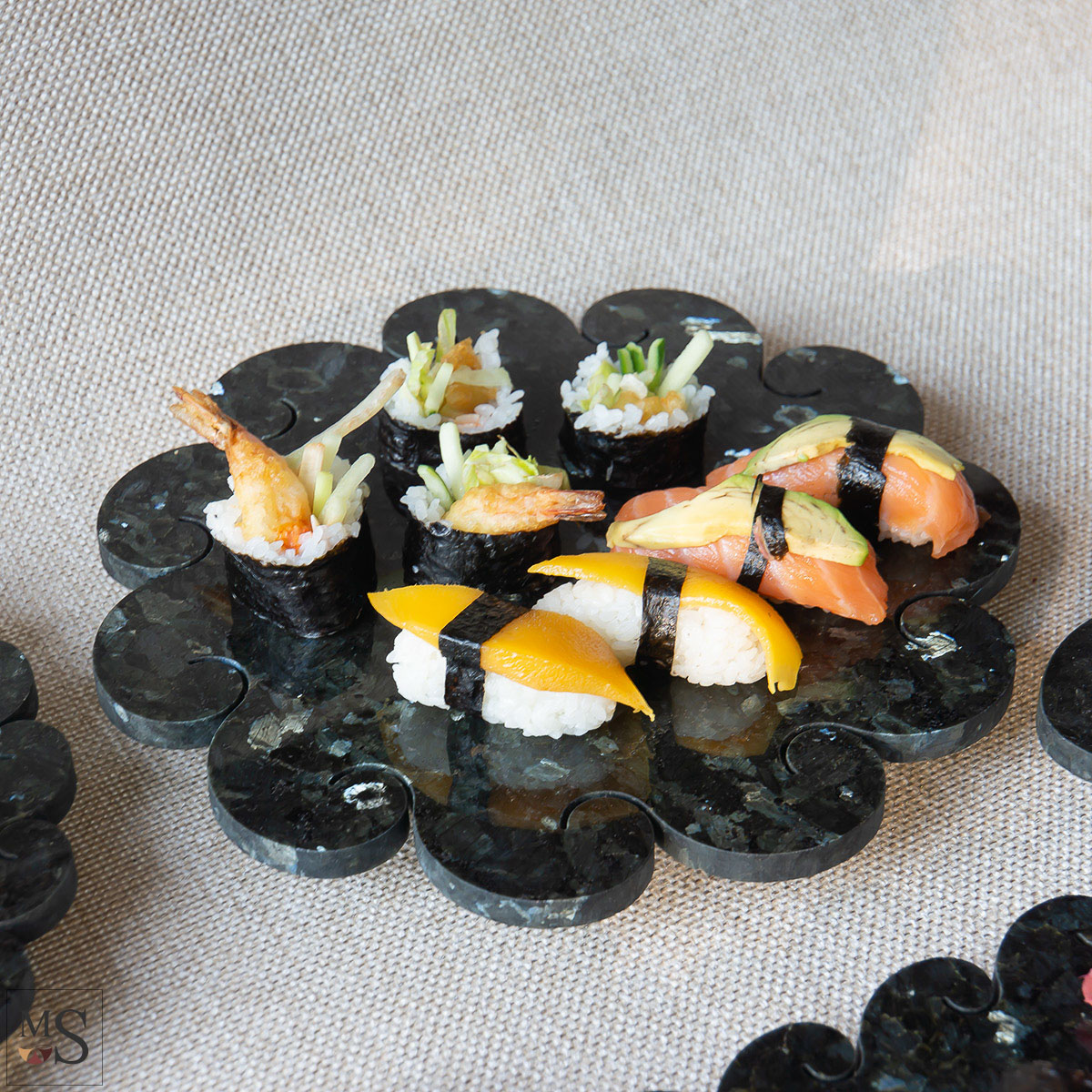 The shape of our Stone Sushi Serving Plates draws inspiration from Japan's rich maritime culture, particularly Hokusai's iconic work "The Great Wave of Kanagawa". The dynamic, semi-circular form has been harmoniously transformed into the elegant lines of our sushi dishes. We applied the principles of the golden ratio and geometry when designing this collection. Stone sushi dishes are also a choice consistent with the Japanese philosophy of respect for natural materials and their energetic properties. Investing in stone dishes is a choice of durability, elegance, and harmony with nature, perfectly harmonizing with the philosophy of Japanese culinary art. The natural material -Volga Blue Labradorite, is a unique stone belonging to the group of igneous minerals and semi-precious stones. It’s very hard and stain-resistant. The stone's dark color with blue reflections evokes the depths of the ocean, providing a perfect contrast to white rice and colorful ingredients. This allows the labradorite to create an elegant backdrop that perfectly highlights the colorful sushi ingredients and gives the meal a unique, luxurious feel. These products are unique on the market and were first presented at the Munich Mineral Show in Germany in 2024. The design is reserved. There are no other similar sushi serving plates made of labradorite stones on sale worldwide.