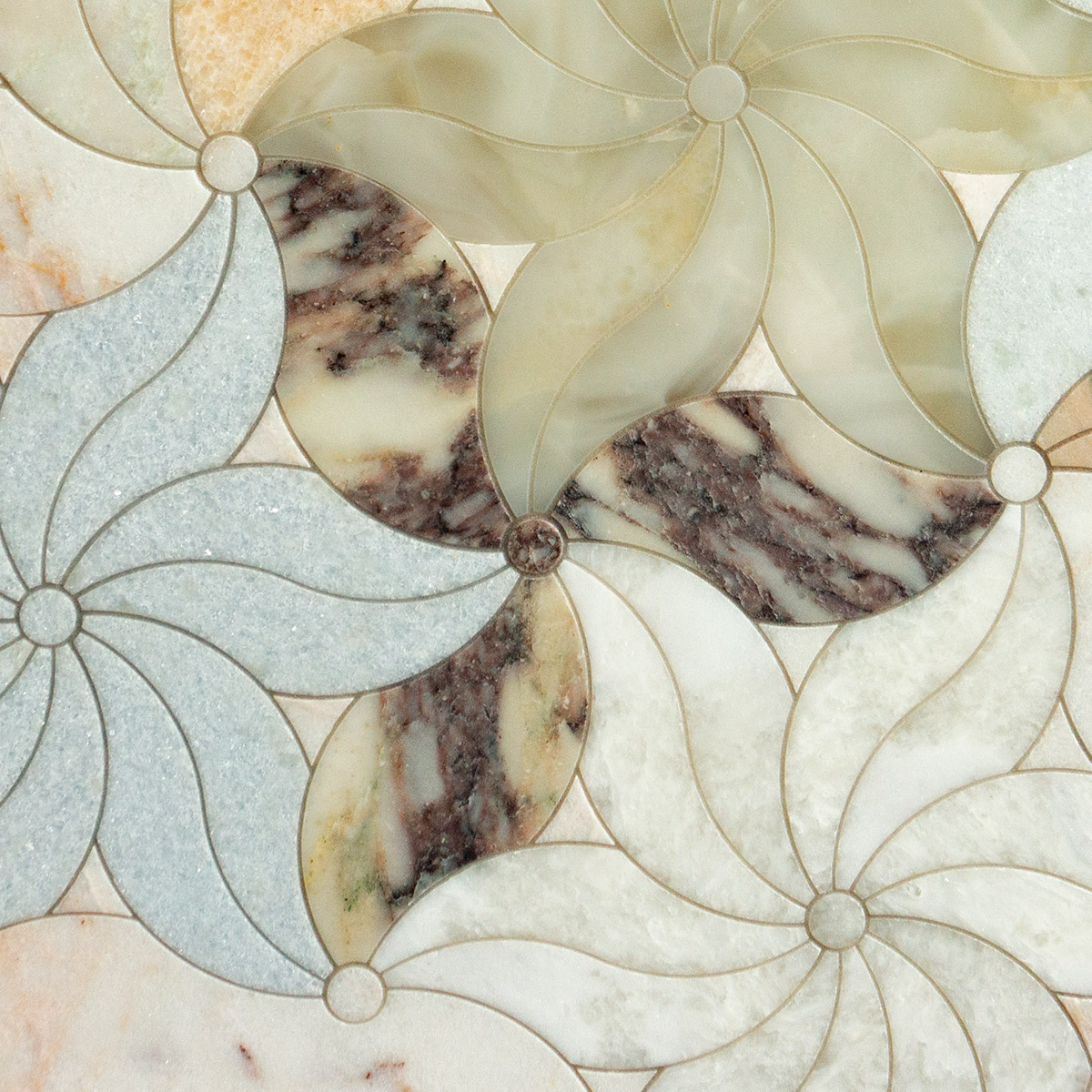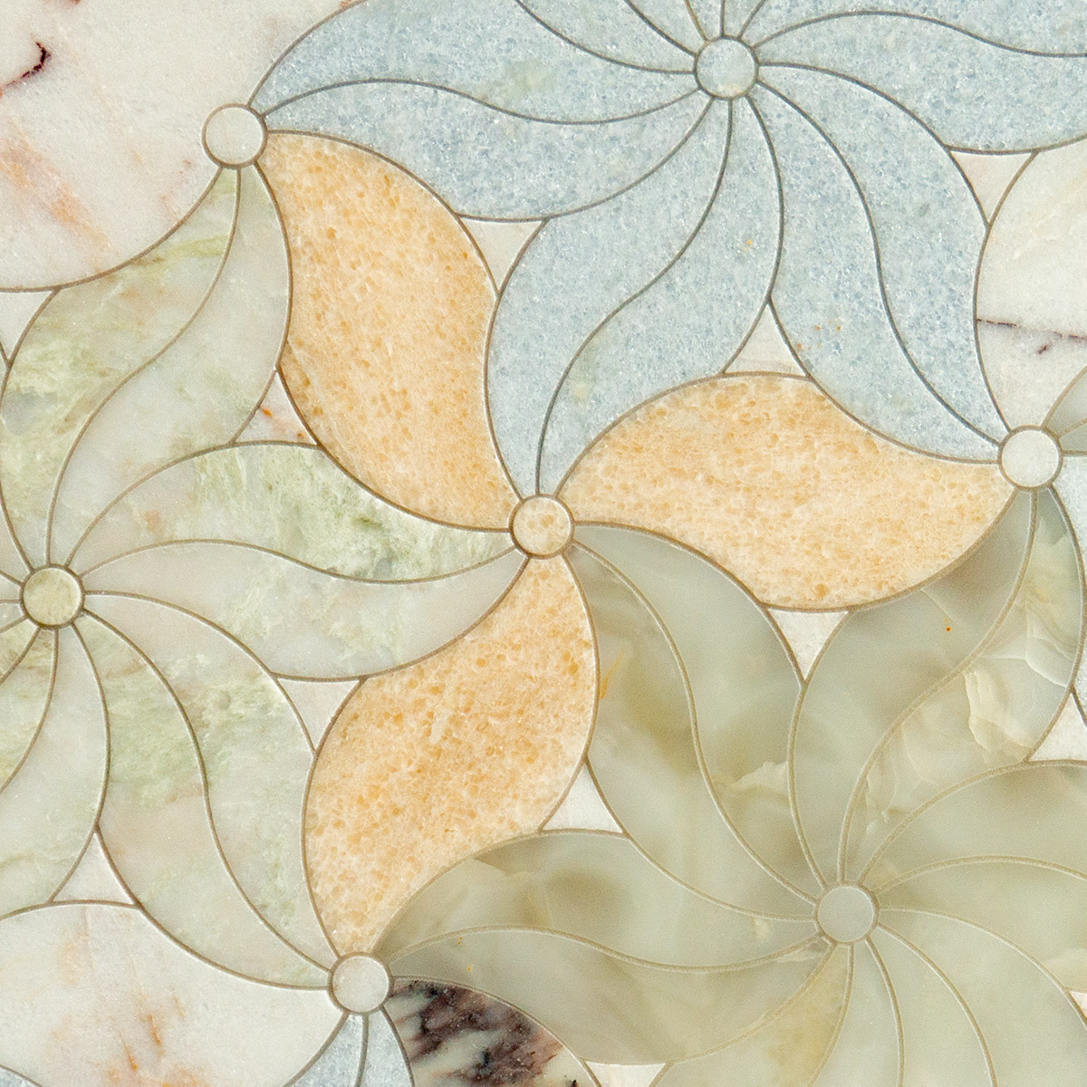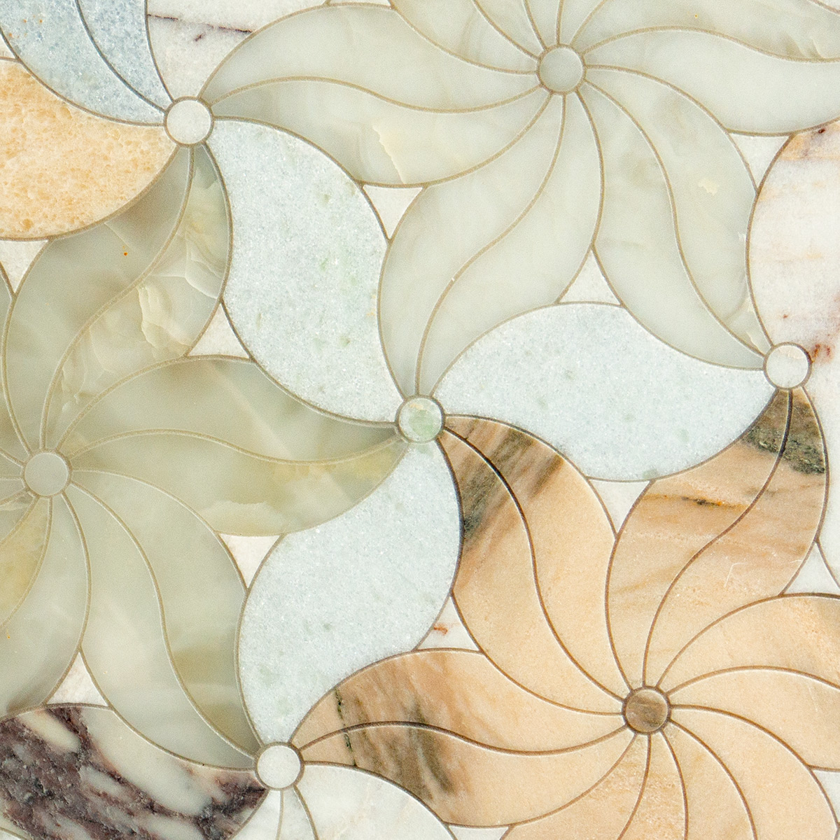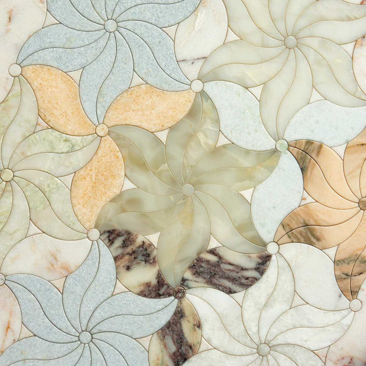 The most luxurious marbles and natural onyx  from around the world were used to create this multicolored mosaic with a floral motif. The pattern resembles a flower meadow, designed to visually warm the space and bring cheerful hues. This mosaic pattern is extremely flexible in terms of color, allowing you to select stone colors that will match the space. The mosaic features two types of flower shapes, with three and twelve petals. The best visual combinations for this pattern come from two different shades or stone colors arranged alternately, or a multicolored arrangement, as shown in the photos.