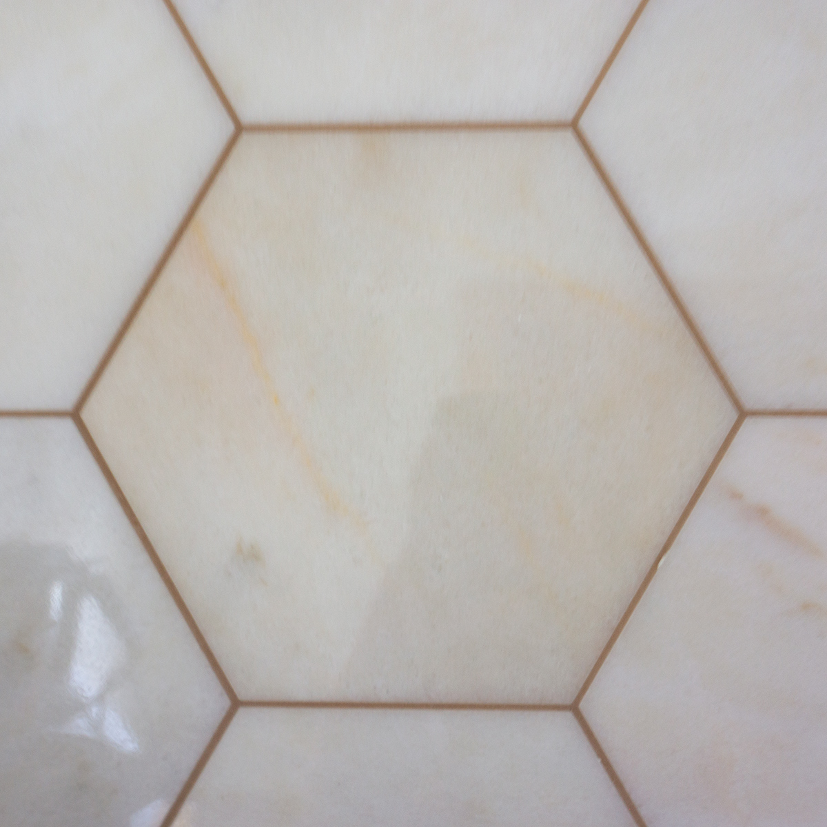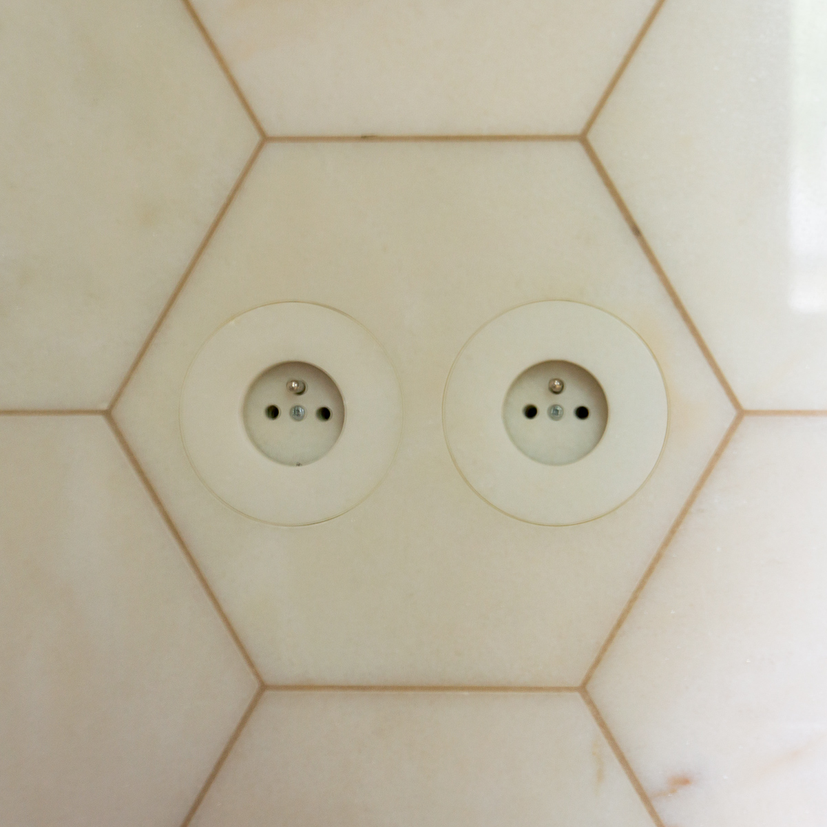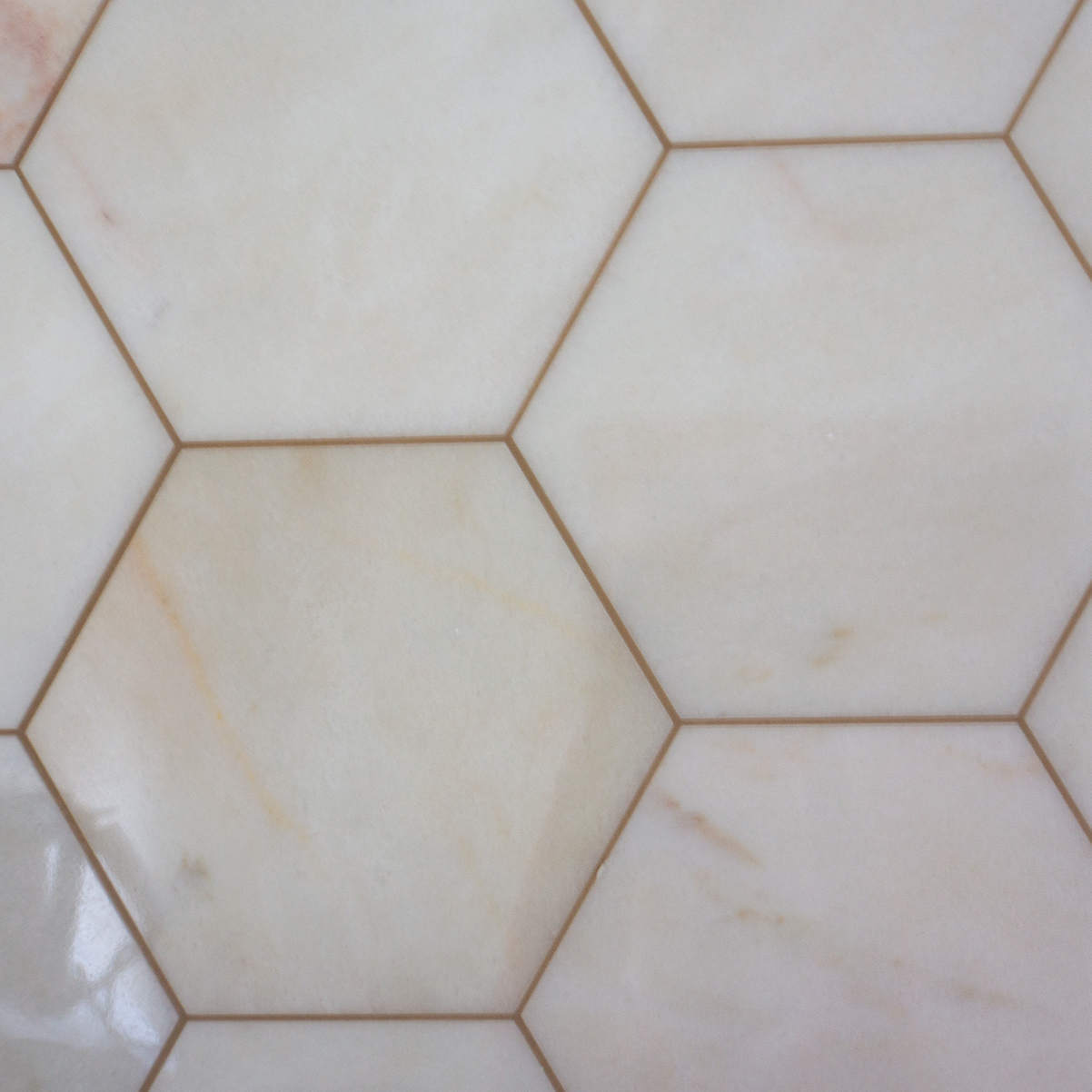 A beautiful and delicate marble called Rosa Portogallo was specially selected for this simple hexagonal pattern. The color of this fine-crystalline stone is light, with delicate shades of pink and pale yellow, reminiscent of a honeycomb mosaic. A grout containing dark honey-colored glass spheres completes the look. This stone is partially transparent, giving the mosaic a sense of depth by allowing light to penetrate the stone's structure. The versatility of this pattern allows the slices to be perfectly sized to fit the dimensions of the room's walls. Additionally, ready-made elements with holes for electrical components or even complete stone socket covers can be created.